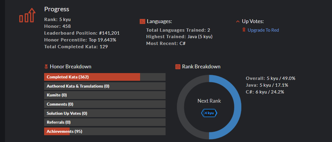 I've completed around 360 tasks on Codewars, some of them on HackerRank, LeetCode. My tech stack: Python, Git, Unity, C#, HTML, CSS